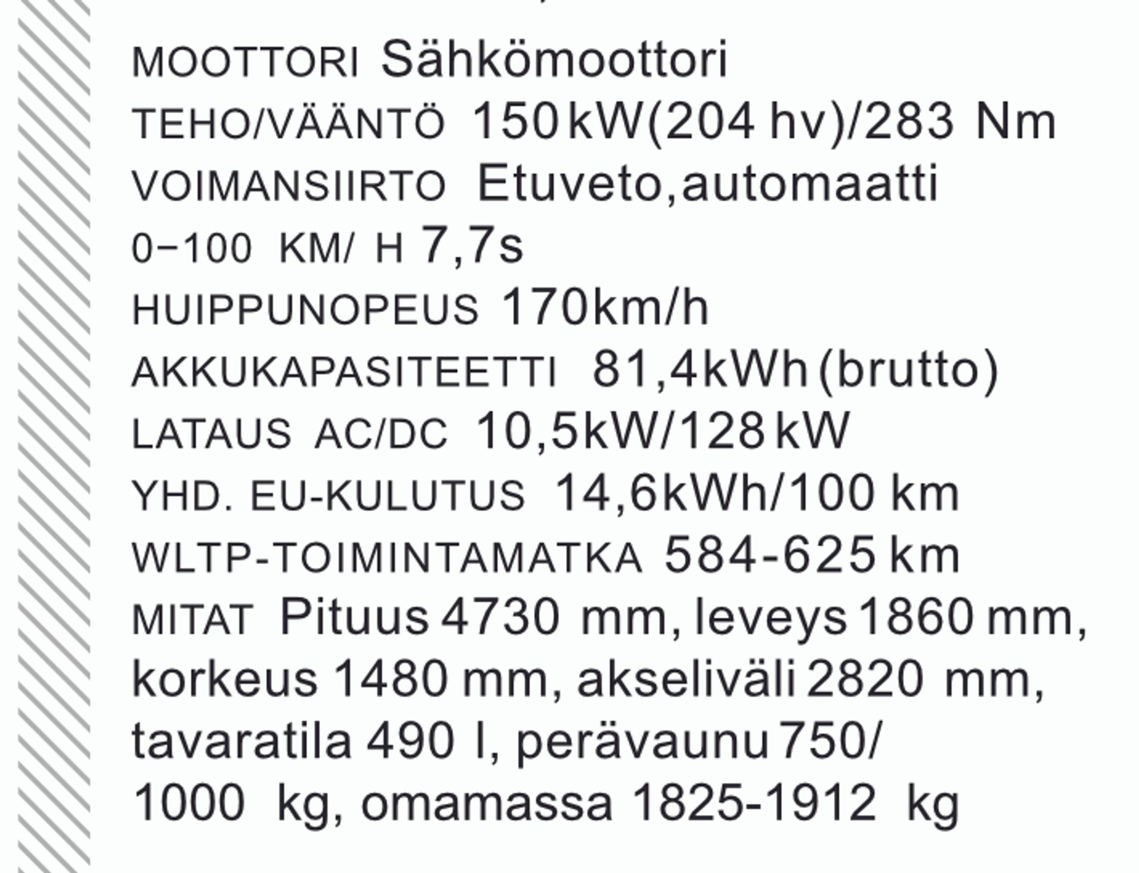 Tarjolla on kaksi eri akkuvaihtoehtoa: 58,3 ja 81,4 kWh (brutto). Toimintamatkaa on WLTP-standardilla, malli-/ varusteversiosta riippuen, 440–633 kilometriä. Käytännössä tietenkin vähintään neljänneksen voi luvatusta silpaista aina pois, talvella vieläkin enemmän. EV4:n pikalatauksen 128 kilowatin latausteho alkaa olla tämän päivän mittapuulla alimittainen; toisaalta latauskäyrä pysyy lähellä maksimia harvinaisen pitkään. Kyllä tällä autolla siis pidempiäkin reissuja tekee.