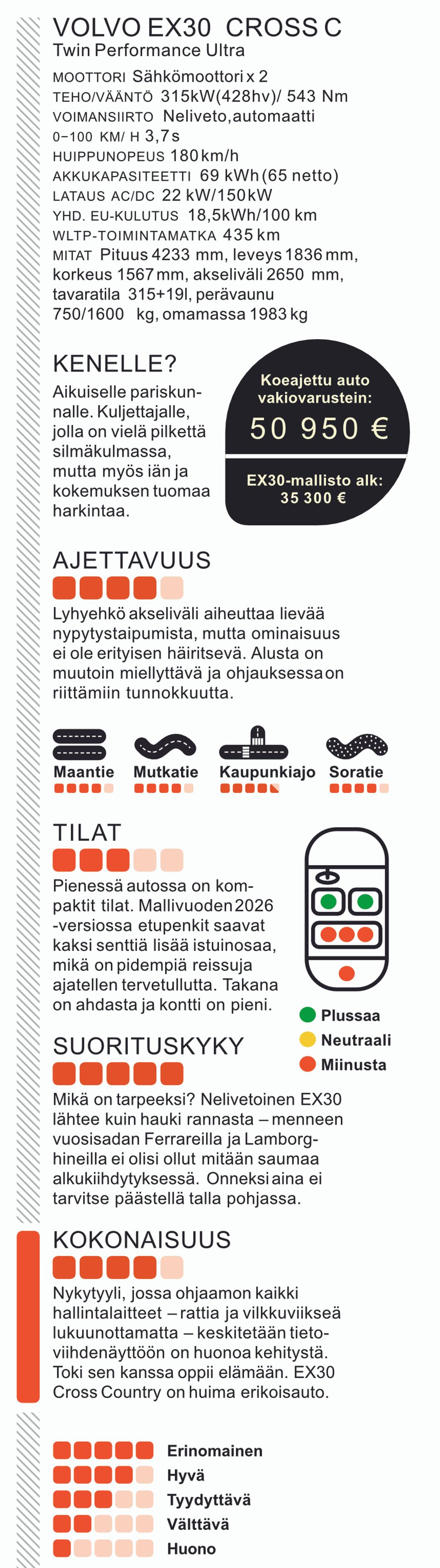 Tämän Volvo EX30 -mallin voimavaroissa ei ole mitään tolkkua. Pieni, maastohenkinen perheauto loikkaa nollasta sataseen 3,7 sekunnissa. Huippunopeus on sentään kaikkien Volvojen tapaan rajoitettu lukemaan 180 km/h. 428 hevosvoimaa, 543 newtonia vääntöä ja neliveto takaavat sen, että liikennevaloissa ei tarvitse katsella kuin peileihin. Eri kysymys sitten on, miksi tavallisen auton pitää olla näin (älyttömän) tehokas.